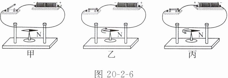 3. 某同学利用如图 20 - 2 - 6 所示装置进行如下实验:断开开关,小磁针的指向如图甲所示;闭合开关,小磁针的偏转情况如图乙中箭头所示;只改变电流方向,再次进行实验,小磁针的偏转情况如图丙中箭头所示。下列结论合理的是( )