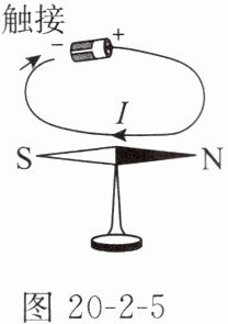 1. 如图 20 - 2 - 5 所示,使导线与电池触接,电路连通的瞬间磁针发生偏转。这一现象不仅能说明通电导线周围存在____,还能说明力可以改变物体的____。