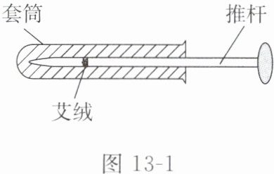 例2 传统文化(多选)我国古代的一种活塞式点火器如图13-1所示。以牛角作套筒,木质推杆前端粘附艾绒。取火时,一只手握住套筒,另一只手猛推推杆,艾绒即燃,随即将杆拔出,口吹立见火苗。在手推杆入筒的过程中,筒内密封气体的( )