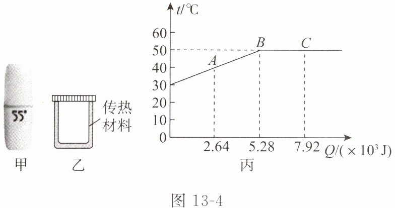 4. 科技应用图13-4甲为一款新型水杯,将沸水倒入杯中,轻摇几下后,水温便可降至55℃左右,并能保温3小时。图13-4乙为其内部结构图,杯壁的不锈钢夹层中有晶体传热材料,其在常温下是固态,会随着温度的变化发生可逆的固液转换。取0.3kg该晶体材料,对其进行加热,其温度与吸收热量的关系如图13-4丙所示。下列分析正确的是( )