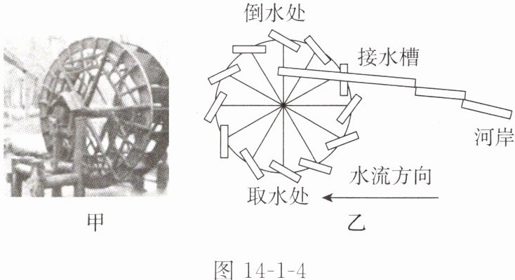 2. 传统文化《天工开物》是我国古代的科学著作,其中这样写道:“凡河滨有制筒车者,堰陂障流,绕于车下,激轮使转,挽水入筒,一一倾于枧内,流入亩中,昼夜不息,百亩无忧。”该段文字描述了筒车这样一种以水流作动力,用来取水的机械,如图 14 - 1 - 4 所示。筒车“昼夜不息”,______(选填“能”或“不能”)说明它是永动机,理由是______。