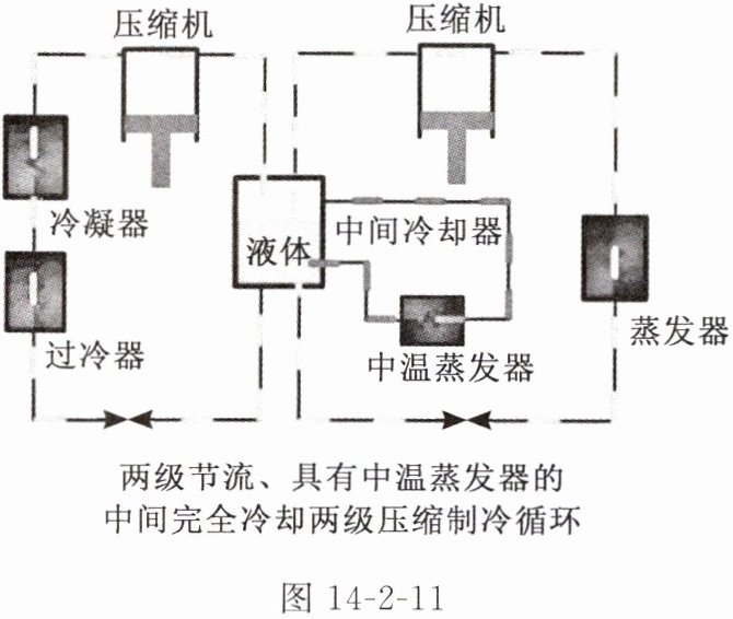 (4) 冷却系统包括水泵、散热器、风扇等组件,负责控制发动机的温度,使其保持在适当范围内。冷却系统的工作循环如图14-2-11所示,其中压缩机通过______的方式改变物体的内能,冷凝器、过冷器、蒸发器通过______的方式改变物体的内能。(均选填“热传递”或“做功”)