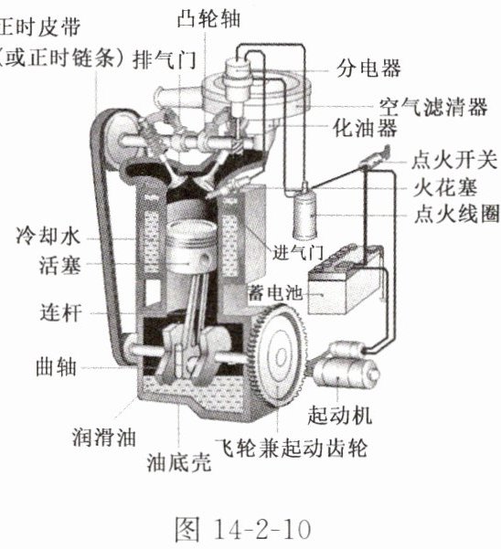 9. 工程实践常见发动机的总体构造如图14-2-10所示,该发动机总体由两大机构、五大系统构成。两大机构为配气机构、曲柄连杆机构;五大系统为冷却系统、润滑系统、燃料供给系统、点火系统、起动系统。