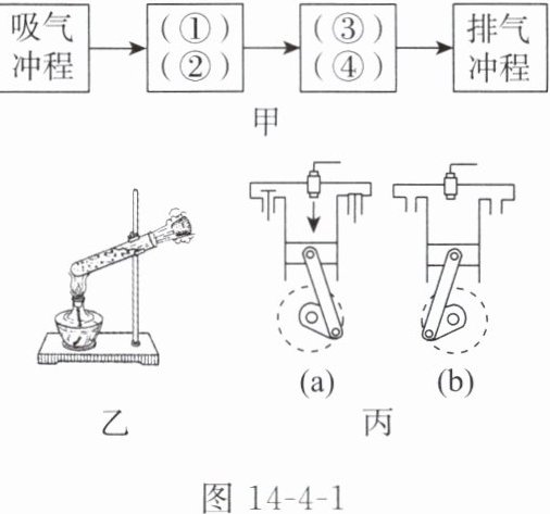 (1)图 14-4-1 甲中的流程图可用来说明汽油机的一个工作循环及各冲程的主要能量转化情况,请将其补充完整。