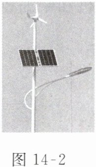 例 2 如图 14 - 2 所示,某乡镇道路两旁安装的风光互补路灯,其顶部装有发电机,中间有太阳能电池板。当无风有光时,可以通过太阳能电池板发电;有风无光时通过风力发电机发电;二者也可同时发电,日夜为蓄电池充电。1 台风光互补路灯 1 年大约可发电$3.6×10^9$ J,已知$c_{水}= 4.2×10^3$ J/(kg·℃),煤炭的热值为$3×10^7$ J/kg。