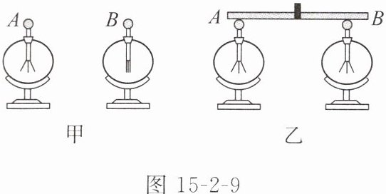 4. 如图15-2-9甲所示,验电器A的金属箔因带负电而张开。用带有绝缘柄的金属棒把验电器A、B两金属球连接起来后的情景如图15-2-9乙所示。该过程金属棒中( )