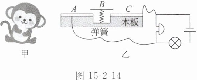 10. 科技应用小明买了一只如图15-2-14甲所示的玩具猴子,其内部电路如图15-2-14乙所示。猴子的香蕉初始时放在B处,B压住弹簧片和AC相连,拿走猴子手中的香蕉,B会在弹簧的作用下弹起。接通电源后,若小明拿走了猴子的香蕉,则猴子最可能会( )