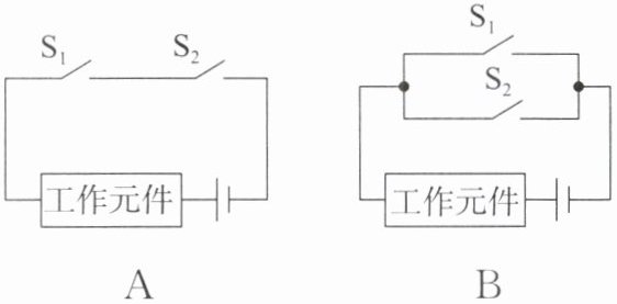 8. 智能锁可以利用指纹开锁。小东想设计一个用指纹控制工作元件开锁的电路,指纹识别成功相当于开关闭合。录入两个人的指纹信息,每个人都能单独用指纹控制开关,启动工作元件开锁。图15-2-12中的电路符合要求的是( )