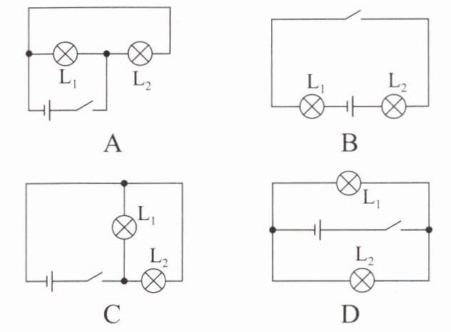 B 【解析】闭合开关后,电流只有一条回路的是串联电路。题图A、C、D中,闭合开关,电流从电源正极流出,分别通过L₁、L₂后回到负极,有2条回路,是并联;题图B中,闭合开关,电流从电源正极流出,依次通过L₁、L₂后回到负极,有1条回路,是串联,故选B。
