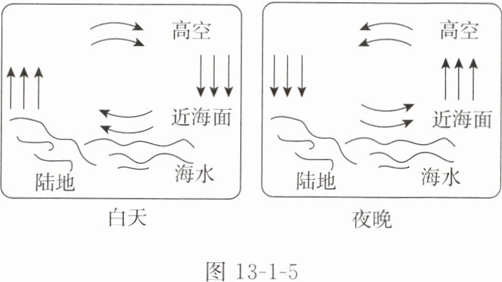7. 跨学科(多选)炎炎夏日,小丽来到美丽的海滨城市青岛。她发现,在这里白天的风常常从海面吹向陆地,并画出了本地陆地和海面之间空气流动情况的示意图,风由气压高的位置吹向气压低的位置,如图13-1-5所示。导致昼夜风向不同的原因包括( )