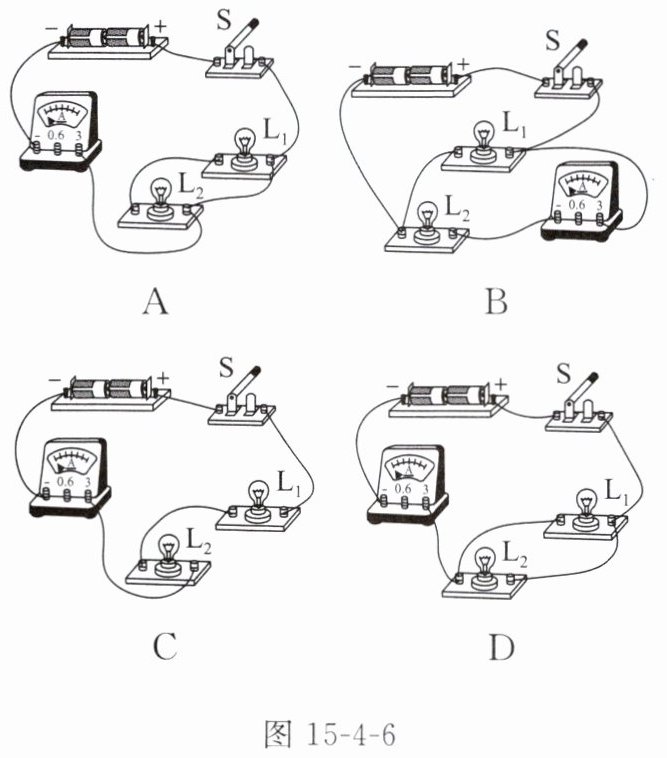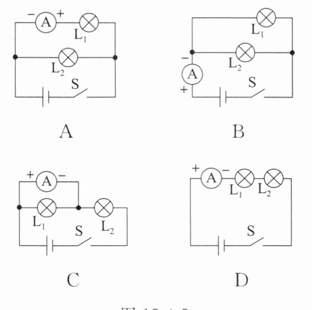 4. 图15 - 4 - 5所示电路图中,闭合开关后,电流表能正确测出通过灯泡$L_1$电流的是( )