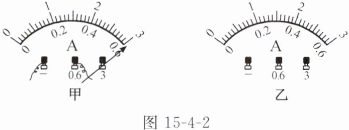 2. 某同学在使用电流表测量通过某一个灯泡的电流时,闭合开关后发现电流表的指针偏转到如图15 - 4 - 2甲所示的位置,于是他立即断开开关。