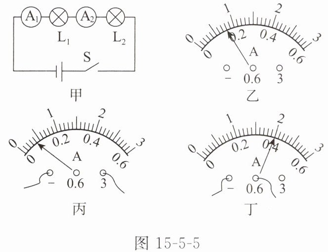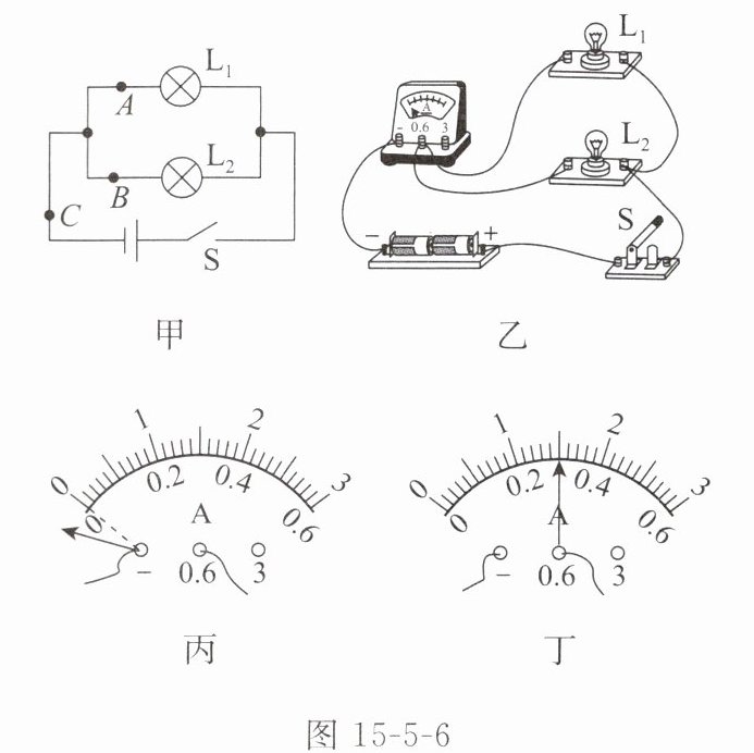 (2) 测量 $ A $ 处的电流时,发现电流表的指针如图 15 - 5 - 6 丙所示,原因是 ________________________。排除故障后,电流表的指针如图 15 - 5 - 6 丁所示,则电流表的示数为 _______ $ A $。