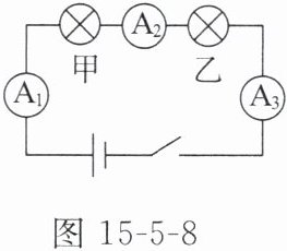 1. 在图 15 - 5 - 8 所示的电路中,闭合开关后发现小灯泡甲比乙暗,则三个电流表的示数关系正确的是( )