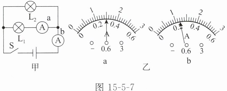 2. 图 15 - 5 - 7 甲所示电路中,当开关 $ S $ 闭合后,电流表指针的偏转如图 15 - 5 - 7 乙所示。其中电流表 $ a $ 测量的是通过 _______ 的电流,电流表 $ b $ 的示数应为 _______ $ A $,通过 $ L_2 $ 的电流是 _______ $ A $。