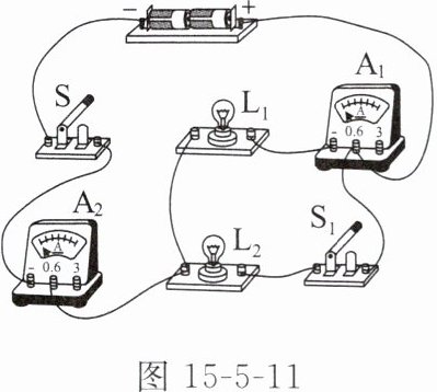 4. (多选)在图 15 - 5 - 11 所示的电路中,闭合开关 $ S $、$ S_1 $ 后,电流表 $ A_1 $ 的示数为 $ 0.3 \, A $,电流表 $ A_2 $ 的示数为 $ 0.5 \, A $,下列说法正确的是( )