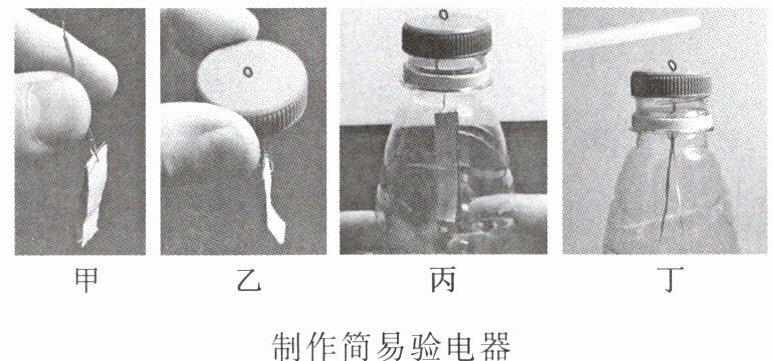 3. 组装:在塑料瓶盖上钻一个小孔,把金属杆直端穿出瓶盖外侧,然后弯折固定在瓶盖上(如图乙),把瓶盖拧在瓶子上面,验电器就制作好了(如图丙)。
