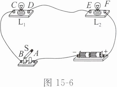 如图15-6所示,闭合开关S,两灯都不亮,当用一根导线分别连接A、B和C、D接线柱时,两灯都不亮;连接E、F接线柱时,只有一只灯泡发光。则电路故障可能是( )