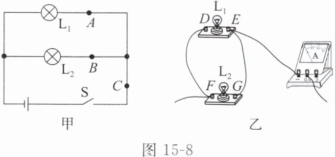 (2)如图15-8乙所示是小红同学连接的并联电路的局部图,她测量完图15-8甲中干路C处电流之后,想测量通过$L_1$的电流,需要拆接电路,依据图15-8乙中D、E、F、G四个接点,你认为最方便的拆接导线方法是_________。