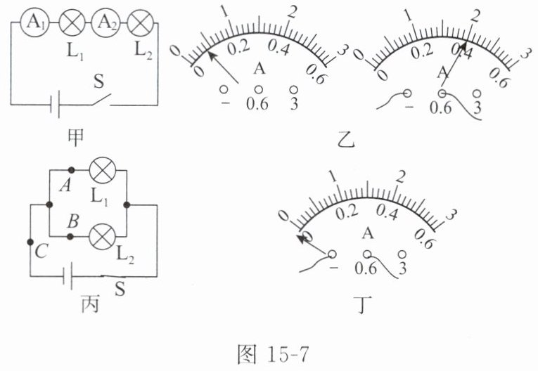 某实验小组用如图15-8甲所示的电路,探究并联电路中电流的关系,其实验思路如下:接好电路后,把电流表分别接入A、B、C三处,测出第1组数据。为了避免偶然因素的影响,他们改进了实验,并想到了两种方法。
