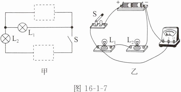 6. (1)请在图 16 - 1 - 7 甲中虚线框内分别填入电源和电压表的符号,使$ L_1 $和$ L_2 $组成串联电路。