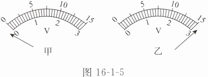4. 某同学在用电压表测电压前,已将指针调到“0”刻度线上,第一次将电压表接入电路时,指针偏转情况如图 16 - 1 - 5 甲,这是因为______;纠正后第二次把电压表接入电路时,指针偏转情况如图乙,这是因为______。