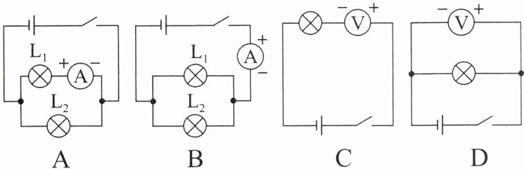 B 【解析】电流从电源流出后,经过$L_{1}$分为两支路,一支路流过$L_{2}$,另一支路流过电压表V,故电压表与$L_{2}$是并联关系,测的是$L_{2}$两端的电压。在串联电路中,可用电压表与电路的两个交点将电路分为两部分,电压表与没有电源的那一部分并联。