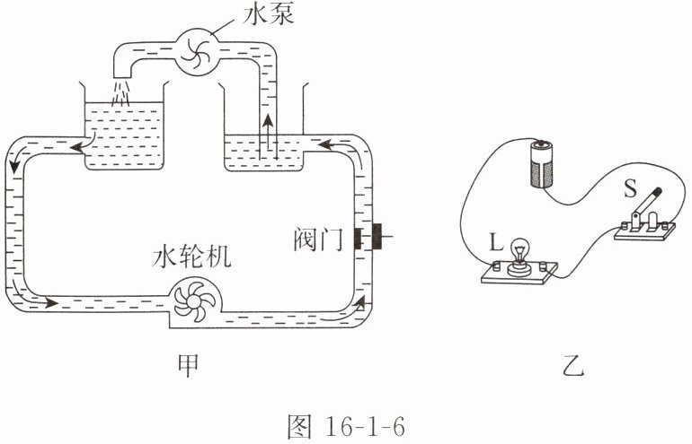5. 实验创新 我们可借助类比的方法,结合水流初步理解电流、电压等概念。图 16 - 1 - 6 甲中的水泵、阀门、水管分别对应图 16 - 1 - 6 乙中的______、______、______。