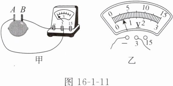 (1)水果电池的正极是金属片_________;电压表指针偏转情况如图 16 - 1 - 11 乙,示数为_________ V。