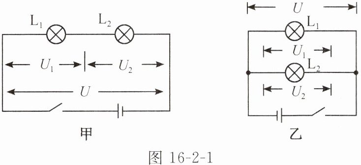并联电路中电源两端的电压与_________相等。在图16-2-1乙所示的电路中,灯泡$L_1$两端的电压$U_1、$灯泡$L_2$两端的电压$U_2$和电源两端的电压U之间的关系是_________(用关系式表示)。