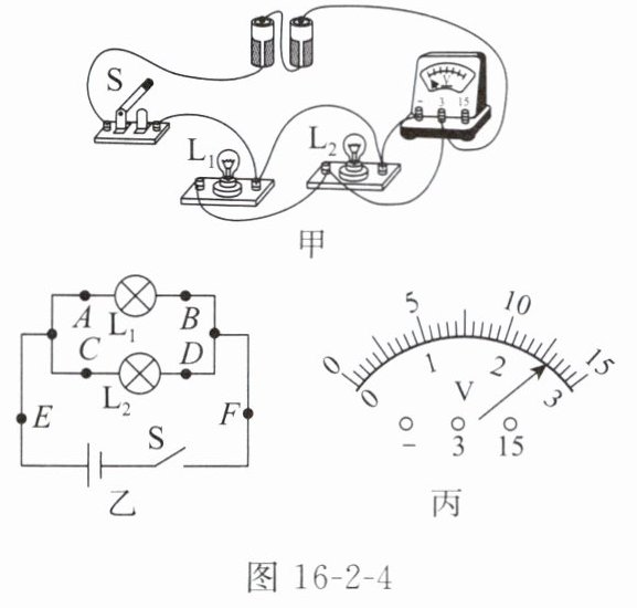 (2) 现要测量$L_2$两端的电压,应将电压表接在图16-2-4乙中的_________、_________两点;此时电压表的示数如图16-2-4丙所示,为_________V。