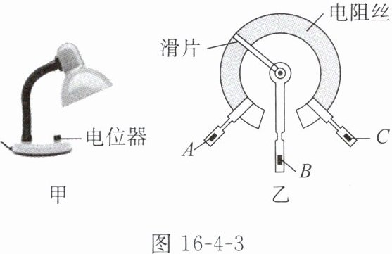 例2 生活应用 图16-4-3甲为一种可调节亮度的台灯,图16-4-3乙为其用于调光的电位器结构图,A、B、C是它的三个接线柱,B与金属滑片相连,转动旋钮,下列判断正确的是( )