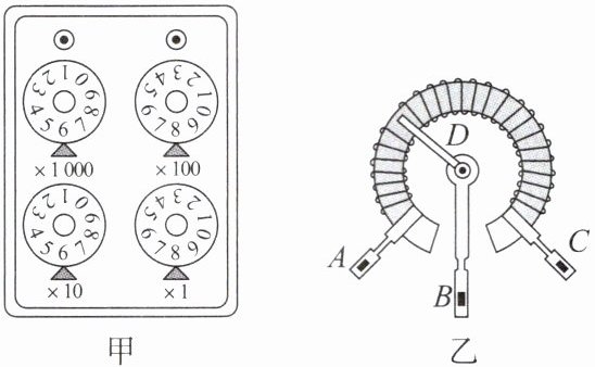 2. 如图16-4-4甲所示的电阻箱的阻值为_____Ω。要使顺时针旋转图16-4-4乙中电位器的指针D时电流表示数减小,则需接入_____、_____两个接线柱。