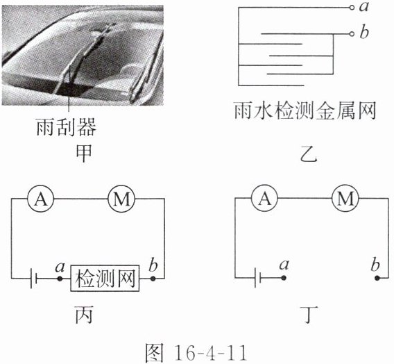 (2) 活动小组发现无雨水时,电动机不能工作,无法实现无雨时车窗的清洗,于是增加了一个电路元件改进了电路,请你将“检测网”和“增加的元件”连入电路a、b间,绘制在图16-4-11丁中。
