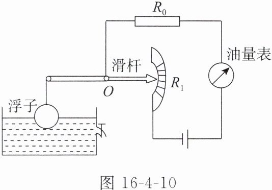 9. 科技应用(多选)如图16-4-10所示是一种测定油箱内油量的装置示意图。其中R₀为保护电阻$,R_1$是滑动变阻器的电阻片,滑动变阻器的滑片跟滑杆连接,滑杆可以绕固定轴O转动,另一端固定着一个浮子。油箱中的油量变化时,浮子随液面升降,带动滑杆使滑动变阻器滑片上下移动,从而改变电路中电表的示数。下列分析合理的是( )