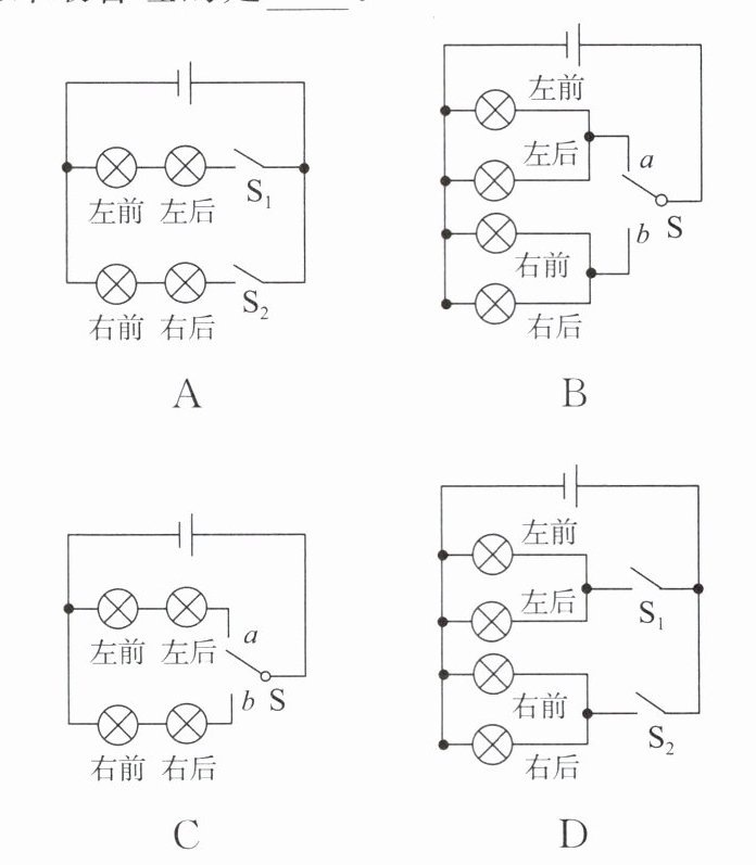(3)汽车转向前后,司机会拨动转向横杆,汽车同侧的前后两个转向灯就会同时闪亮、同时熄灭,其中一个灯损坏后,不影响其他灯的正常工作。转向横杆相当于电路中的开关,不能出现左、右转向灯同时亮的情况。下列电路设计最合理的是______。