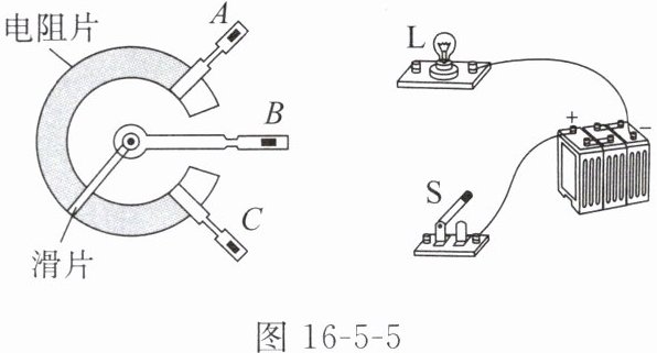 (3)在图16-5-5中,将电位器的A、B、C三个接线端按合理的方式连入电路中,要求顺时针旋转滑片时,灯泡变暗。