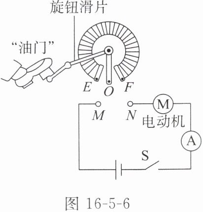 (2)图16-5-6中的E、O、F为变阻器的三个接线柱,驾驶员踩下“油门”时,变阻器阻值减小,电流变大而加快电动机的转速,则电路中M、N应分别与旋钮变阻器的______(选填“E、O”或“E、F”或“F、O”)接线柱相连。