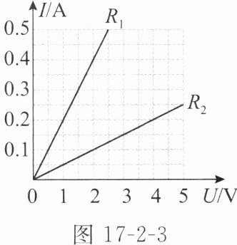 6. 电阻$R_1$、$R_2$的电流与电压的关系图像如图 17 - 2 - 3 所示,则$R_1$____$R_2$(选填“>”“=”或“<”),其中$R_1= $____$\Omega$。