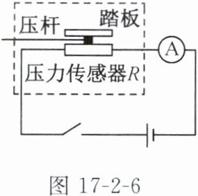 10. 科技 应 用 在我们的日常生活中,有一种测量人体体重的电子秤,其测量部分的原理如图 17 - 2 - 6 中的虚线框所示,它主要由压力传感器$R$(电阻值会随所受压力的大小而发生变化的可变电阻)和显示体重大小的仪表$A$(实质上是电流表)组成。压力传感器表面能承受的最大压强为$1×10^{7}Pa$,且已知压力传感器$R$的电阻值与所受压力的关系如下表所示。踏板和压杆的质量忽略不计,接通电源后,压力传感器两端的电压恒为$4.8V$,$g取10N/kg$。
