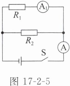 9. 如图 17 - 2 - 5 所示,电源电压保持不变,电阻$R_1 = 15\Omega$。闭合开关$S$,电流表$A_1的示数为0.8A$,电流表$A的示数为1.2A$。求: