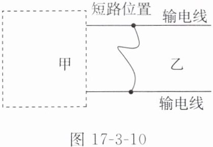 10. 实验创新 如图17-3-10所示,甲、乙两地相距Lkm,两地之间沿直线架设了两条输电线,输电线每千米的电阻值是$ R_0 $。现输电导线某处发生了短路,为了确定短路位置,在切断原电源的情况下,请你在甲地利用实验室常用的电学器材,根据伏安法实验进行检测,确定短路位置与甲地的距离。
