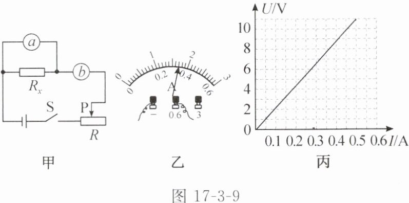 (4) 经多次测量,小明由实验数据绘制出U-I图像(图17-3-9丙)。由图像可知电阻$ R_x = $______。