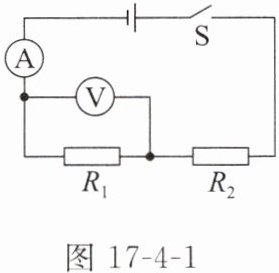 例1 在如图17-4-1所示电路中,电源电压恒定不变,$ R_1 $、$ R_2 $ 为定值电阻,$ R_2 $ 的阻值为 $ 10 \Omega $。闭合开关 $ S $,电压表的示数为 $ 1 V $,电流表的示数为 $ 0.2 A $。求: