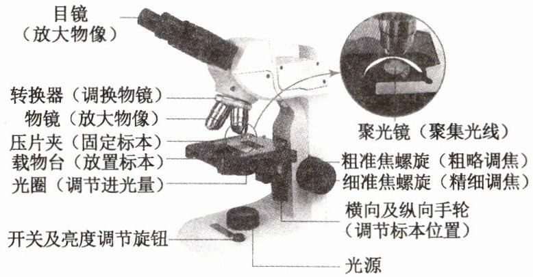 (1)目镜 物镜 电源开关 聚光镜 光圈