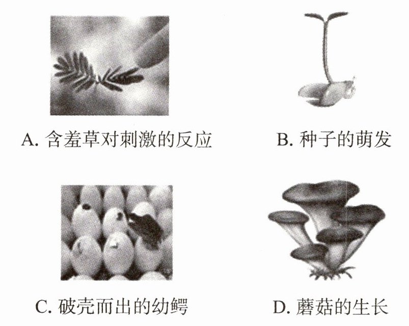 A 【提示】含羞草受到碰触会合拢叶片(叶片收缩),体现了生物能对外界刺激作出反应;种子萌发、幼鳄长大破壳、蘑菇生长体现的是生物具有生长的特征。