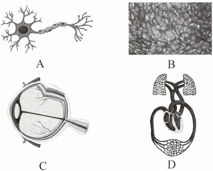 C 【提示】几种不同的组织按照一定的顺序聚集在一起,形成具有一定功能的器官。图中A为神经细胞,B为结缔组织,C为眼球,D为循环系统。