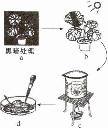 15. 芳芳在老师的指导下进行植物光合作用的探究实验,她用到的植物是天竺葵,并进行了如下图所示的实验操作,请分析并回答下列问题。