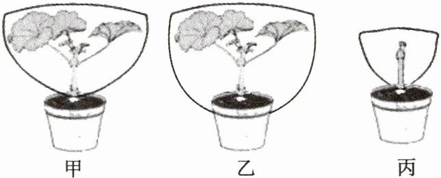 B 【提示】蒸腾作用的主要器官是叶,由于丙装置内的植物没有叶,甲装置和乙装置内的植物都有叶,所以丙装置的塑料袋内壁水珠最少;因为甲装置和乙装置的塑料袋内都有带叶的植物,且两个装置内叶的数量大小相同,唯一不同的是甲装置塑料袋内没有土壤存在,而乙装置塑料袋内有土壤存在,所以甲装置塑料袋内壁水珠来自植物的蒸腾作用,而乙装置塑料袋内壁水珠来自植物的蒸腾作用和土壤中水的蒸发,因此15 min后,塑料袋内壁水珠最多的装置是乙。