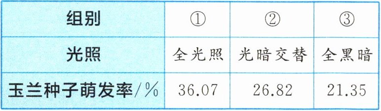 B 【提示】根据表中数据,全光照条件下玉兰种子的萌发率最高,光暗交替条件下玉兰种子的萌发率降低。全黑暗条件下,玉兰种子也能萌发,说明光照不是玉兰种子萌发的必需条件。该实验只有光照条件不同,因此该实验的变量是光照,除光照外,其他条件如水、温度等都应该保持相同且适宜。